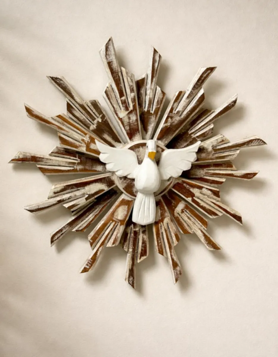 Aqui na Charme Mineiro, tudo nasce do nosso trabalho em família. Cada peça é criada com calma, cuidado e aquele toque único do artesanato mineiro, passado de geração em geração. Este Divino Resplendor de parede tem uma história especial: ele é esculpido para representar a luz do Espírito Santo, feito manualmente para que nenhuma peça seja igual à outra, carregando a alma das Minas Gerais para dentro da sua casa.