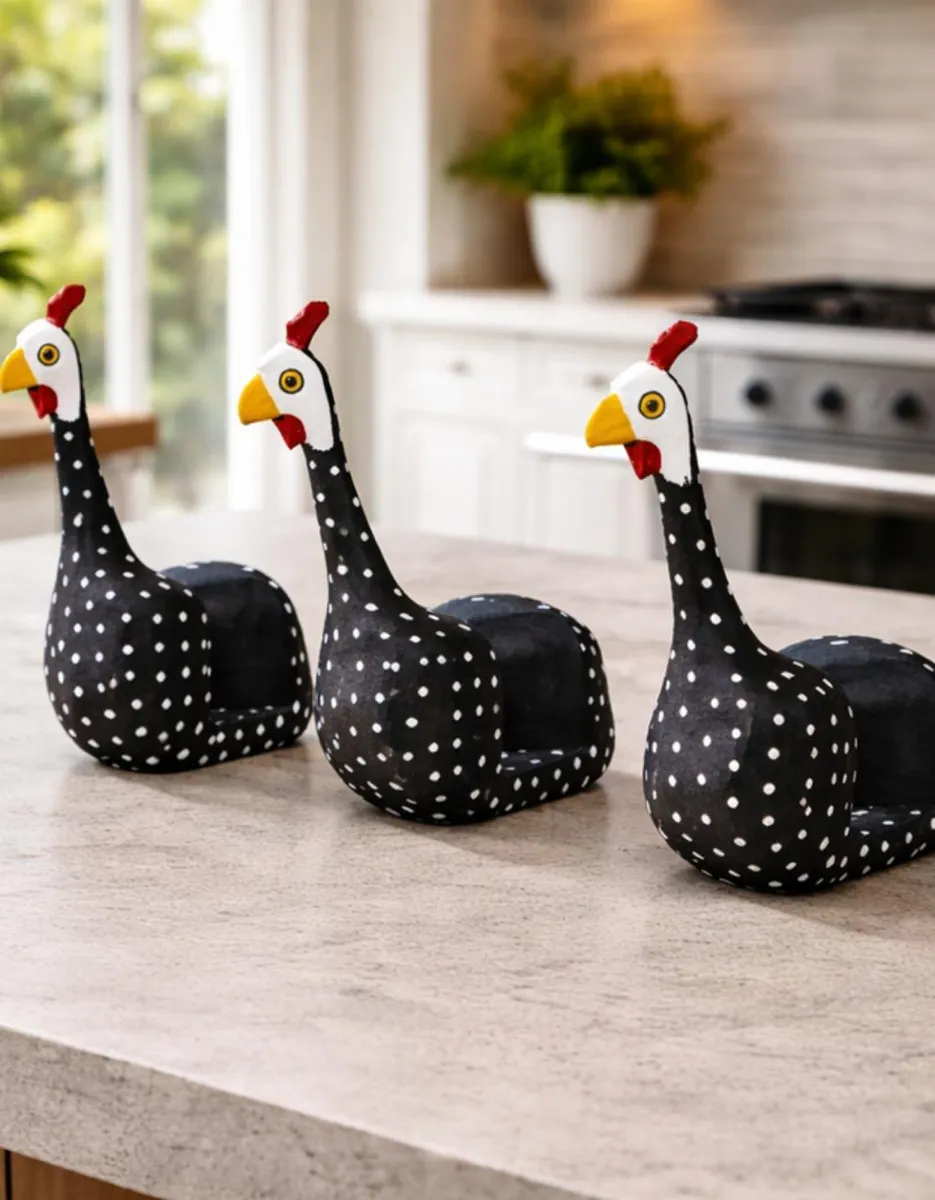 O nosso Kit com 3 Porta Guardanapos de Galinha D'Angola é a solução perfeita para unir utilidade e beleza. Feito em madeira e pintado à mão, ele resolve a bagunça dos guardanapos soltos enquanto decora sua mesa posta com autenticidade rústica. É uma peça que não serve apenas para organizar, mas para encantar e contar história.